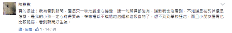 原Po认为“因信任学校,从未怀疑过餐点状况,现在才发现原来是……”,他也指出“给孩子的餐点至少要新鲜均衡,不是说要大鱼大肉,但既然身为教育业,请至少有点良心,希望园方的初衷是为了学生好,而不是自己的口袋饱。”