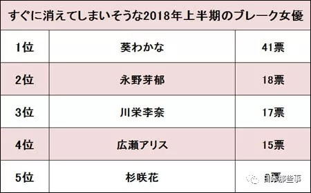 最近又出了一个关联的小型榜单。不过这个榜单看来要搞事,因为它在“2018上半年爆红女演员”后面加了句“哪些看起来很快就会消失?”,不幸成为前五的是葵若菜、永野芽郁、川荣李奈、广濑爱丽丝和杉咲花。