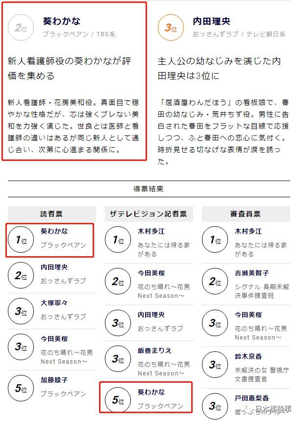 她的表现还得到不少肯定,在上一季的学院赏助演女演员赏读者票第一、电视记者票第五、总合第二名的好成绩。