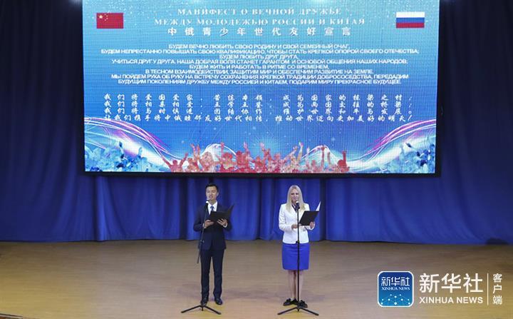 席浚斐和儿童中心辅导员娜塔莉亚共同宣读《中俄青少年世代友好宣言》,声音铿锵,在剧场里久久回荡。