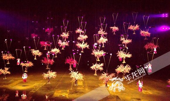 演出现场,在背景音乐的衬托下,漫天桃树“从天而降”,浪漫的桃林下,“刘备”、“关羽”、“张飞”三人相继骑着骏马驰骋而来,一副波澜壮阔的历史画卷在此徐徐展开,这出桃园三结义仿佛穿越了漫长的历史长河,把观众带到了金戈铁马的战争年代。舞台下,1824个座位的观众席座无虚席,伴随情节的展开,观众时而惊叹连连,时而掌声雷动,气氛异常热闹。