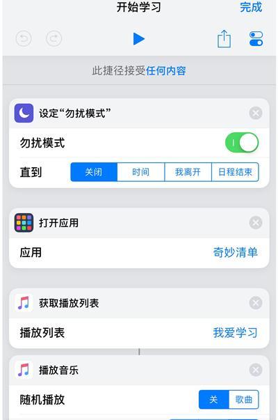 让我们试着做一个简单的捷径:假设我要开始学习,那么iPhone进入勿扰模式,打开「奇妙清单」查看任务,查看完任务后开启本地音乐库中的「我爱学习」歌单,开始播放作业用 BGM,最后在「Bear 笔记」中创建新笔记。