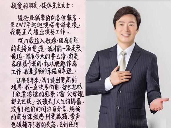 近日,著名歌手费玉清晒出了自己的亲笔书信,正式宣布将在2019年巡回演唱会结束之后,退出演艺圈。在信中,费玉清表示"当父母亲都去世后,我顿失了人生的归属,没有了他们的关注与分享,绚丽的舞台让我感到更孤独,掌声也填补不了我的失落。"