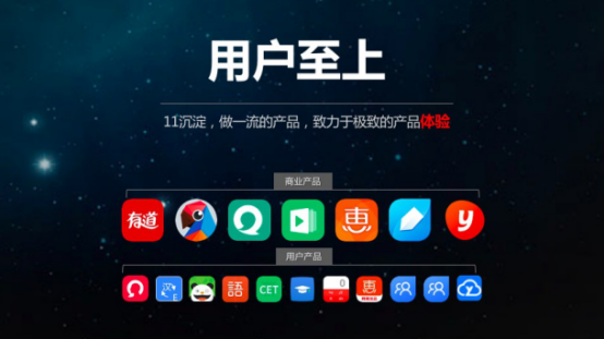 目前,有道已经形成了以网易有道词典、有道翻译官、有道精品课、惠惠购物助手、有道云笔记、有道智选为核心的商业产品矩阵及以有道人工翻译、有道翻译、有道口语大师、有道语文达人、有道四六级、有道考研、超级计算器、有道云协作等为支撑的用户产品阵营,并以用户至上的理念,为用户带来教育领域中极致的产品体验。据介绍,网易有道全平台日均活跃用户保持在5000万+。