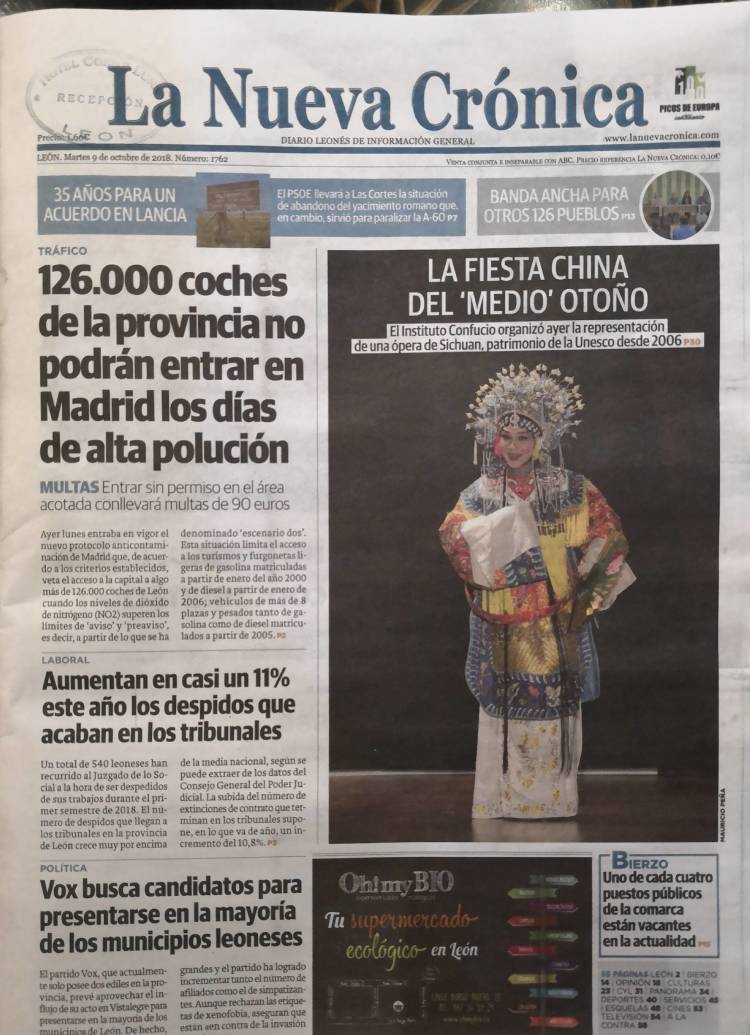 当地时间10月8日,重庆大学川剧巡演团到达西班牙西北部莱昂,当晚就在莱昂音乐厅(Auditorio de León)完成此次巡演的最后一场“曲风雅韵”专场演出。莱昂大学孔子中方院长陈晨博士、外方院长奥斯卡·费尔南德斯博士以及莱昂大学校方领导等出席演出。
