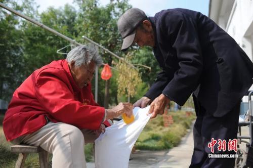 “老王正在剥豆子呢。”听闻要采访105岁的王家朋,安徽省合肥市肥东县响导乡敬老院的其他老人纷纷指路。秋日里,王家朋坐在轮椅上剥着毛豆晒着太阳,105岁的老伴陈红英则在不远处推着轮椅散步。