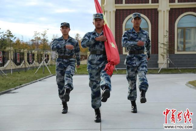 10月1日清晨,在雄壮的军乐声中,3名旗手步伐坚定,护卫着五星红旗走向连队升旗台。
