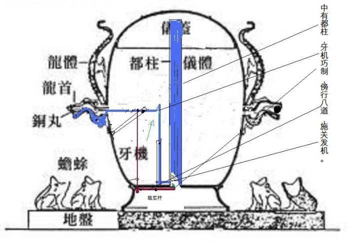“以精铜铸成,员径八尺,合盖隆起,形似酒樽,饰以篆文山龟鸟兽之形。中有都柱……”是《后汉书》中关于地动仪的全部描述。后世的所有研究都是建立在这段文字的基础上。多少年来,学界对于这段记载逐字逐句都进行深入分析,仅其中“都柱”的理解,就产生了 “立柱”“倒立摆”“悬垂摆”等多种。