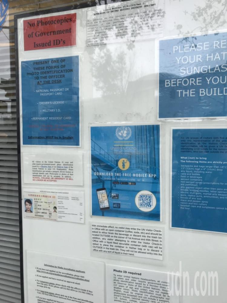 《联合报》记者说,联合国总部警卫人员指着旁边的看板说,最新规定是中国大陆发给台民众的“台湾居民来往大陆通行证”已被规定不能入内,但大陆护照和其余的大陆证件都可以入内。