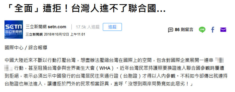 12日,绿媒也开始关注台湾记者的闭门羹待遇。三立电视台就引述了联合新闻网的报道,并在标题上表达了惊讶:《全面遭拒!台湾人进不了联合国》。
