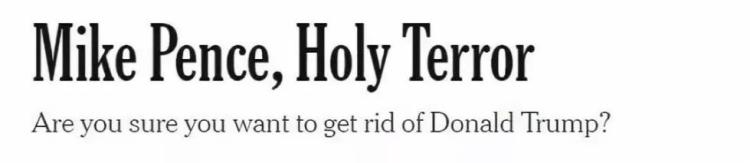 扭腰时报一篇题为“迈克⋅碰瓷:神圣恐怖”的文章也森森认同,如果“碰瓷”取代特朗普,美国就从“盗贼政治”到了“神权政治”。因为“碰瓷”有着特朗普并不真正拥有的一种信念:他坚信自己是上帝的使者,并决心以自己的信仰重塑整个国家。