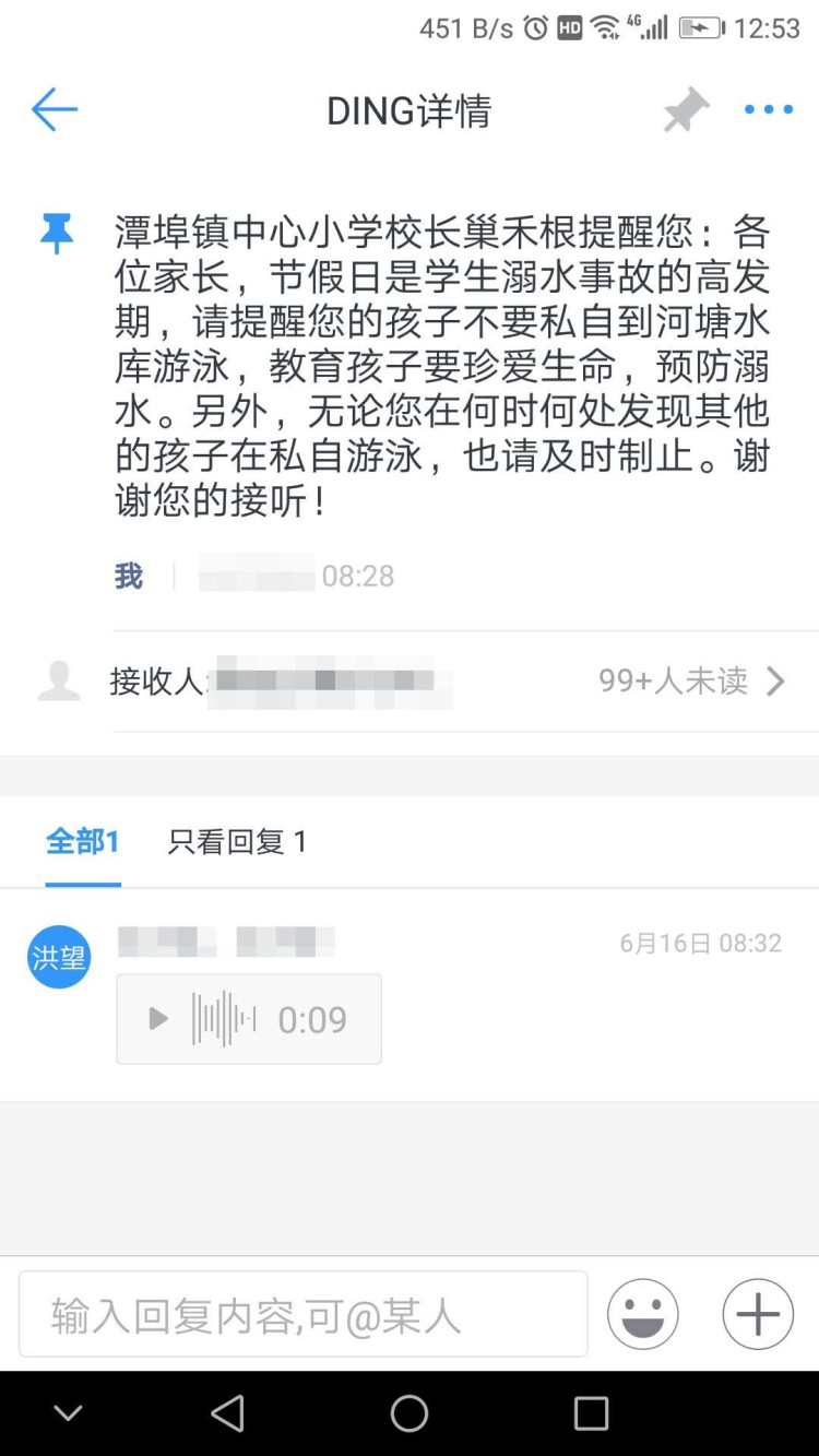 江西万载县潭埠镇中心小学的校长巢禾根在今年暑期防溺水工作中,利用“钉钉”办公软件独有的“DING”功能的电话通知,给6000多学生家长拨打防溺水电话。全镇有6000多名学生家长,往年都是通过人肉方式挨个通知,一次性通知到位很难实现,动员全体老师都要花几个小时时间。再挨个通知学生通常要花费好几天时间。现在通过钉钉实现了几秒钟快速通知,并且可以在暑期多次提醒,实现了暑期零溺水的目标。