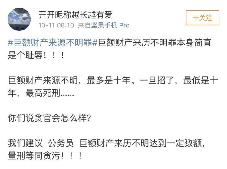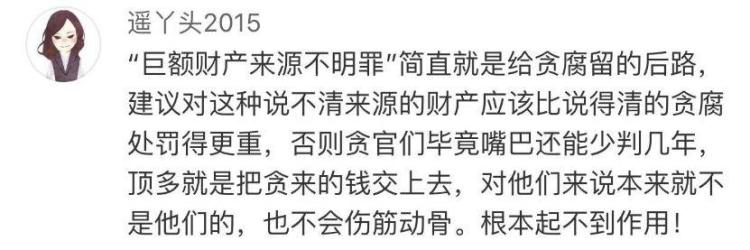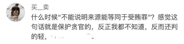 对此,网友评论炸锅了:“这难道不应该按照贪污罪判刑吗?”、“巨额财产来源不明罪这不成了贪官的挡箭牌了?”