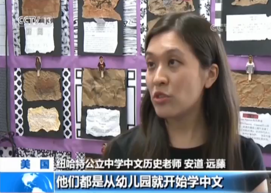 纽哈特公立中学 中文历史老师 安道⋅远藤:他们都是从幼儿园就开始学中文,他们的中文真的是都蛮好的。他们一般对话、跟老师讲话或跟同学讲话都是说中文的。