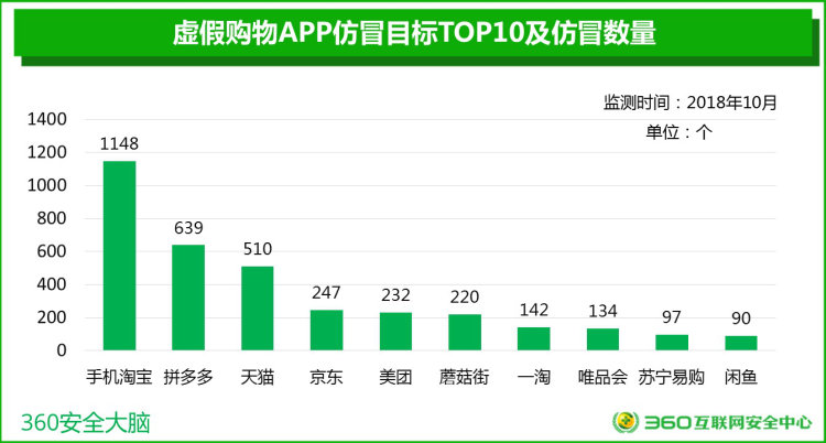 其仿冒阵容颇为强大。根据近一个月的监测数据,被仿冒最多的购物APP为手机淘宝,达到了1148个,其次是拼多多,达到了639个,天猫、京东、美团、唯品会等购物平台都在被仿冒的前十名。