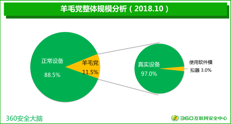 根据报告,仅今年10月,360安全大脑就监测和识别出羊毛党设备逾6797万个,约占互联网上活跃安卓设备总量11.5%。