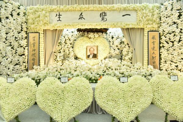 据殡仪馆工作人员介绍,灵堂布置以白色为主,两侧放满花牌。金庸遗照外围铺满了白色花朵并被砌成心形,遗照上方安放着“一览众生”匾额,两旁的挽联则写着:“飞雪连天射白鹿,笑书神侠倚碧鸳”。