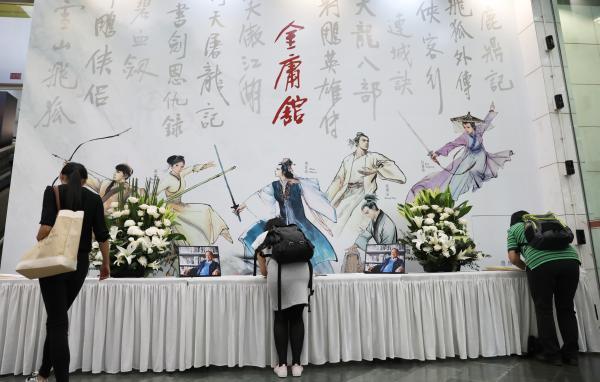 4时整,吊唁处向公众开放。吊唁处的背景是一张巨幅海报,上方印有金庸十二部小说的书名,下方则为多个经典人物形象。背景前方有一排铺着白布的长桌,桌上放置着白色鲜花、相框及三本留言簿。人们在工作人员的指引下有序入场,留言吊唁。