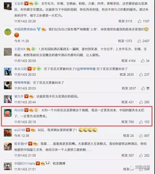 如此巨大的互动量从何而来?由于花总本身便是知名大V,早期也多次在微博上分享关于酒店入住的感受与测评,此次曝光微博获得了@王志安 @王星WX @来去之间 @向小田 @wu2198 @侯安扬HF 等一众大V的传播扩散,其中@向小田 转发时表示“大约一个月前花总说要做这个视频,我说一定要发出来,中国的服务业太烂了,一定要告诉消费者。”