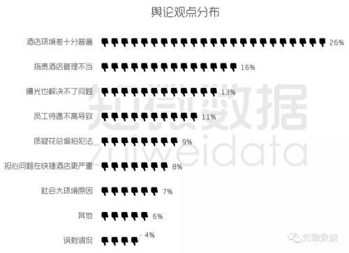 从目前网友观点来看,在历史报道的铺垫下,主流舆论其实对于酒店卫生基本上长期持负面态度,即使曝光后,多数网友表示酒店环境差早就十分普遍(26%),同时也指责酒店管理不当(16%),8%的观点担心快捷酒店卫生问题更加严重。而本次花总曝光,部分酒店已经是“二进宫”,显然让网友认为此前的整改并未有明显效果,导致13%的观点认为曝光也解决不了问题。