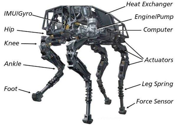 相较于传统的轮式或履带式机器人,四足机器人能够适应更多的地形地貌,通过性能更强。Bigdog的四条腿完全模仿动物的四肢设计,内部安装有特制的减震装置,内部计算机可根据环境的变化调整行进姿态,而大量的传感器则能够保障操作人员实时跟踪“大狗”的位置并监控其系统状况,其动力来自一部带有液压系统的汽油发动机。但后来由于BigDog被认为声音太大,不能在战斗中使用,该项目被搁置。