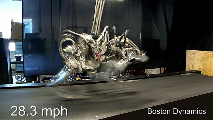与BigDog类似的,还有一个叫做“猎豹”(Cheetah)的四足机器人,从名字就可以看出这个机器人的特点,猎豹的速度可以达到每小时20-30英里(约合32-48千米每小时),DRAPA为这个机器人的研发提供了资金。该机器人拥有柔韧灵活的脊柱和铰链式的头部,能够冲刺、急转弯并能突然急刹停止。它的奔跑速度达到了每小时28英里(约合45公里/小时)。而猎豹机器人的躯体上方连接着多根线缆,这也注定它只能是一款在实验室中运行的机器人。