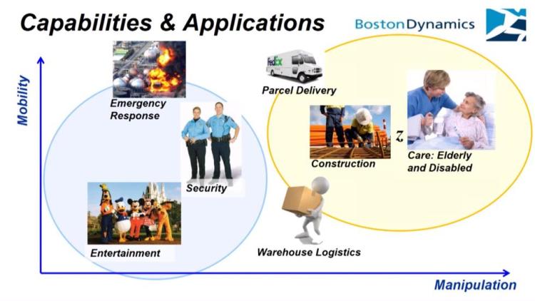 图中蓝色气泡包含了波士顿动力近期的目标应用,右边的黄色气泡则包含了波士顿动力的长期目标