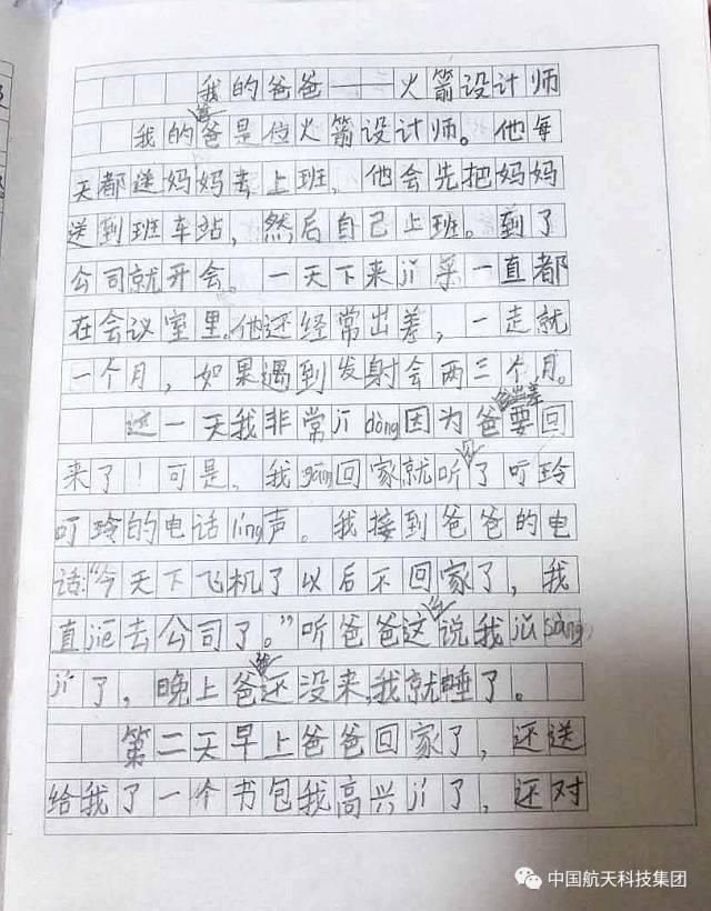 我的爸爸是位火箭设计师。他每天都送妈妈去上班,他会先把妈妈送到班车站,然后自己上班。到了公司就开会,一天下来几乎一直都在会议室里。他还经常出差,一走就一个月,如果遇到发射会两三个月。