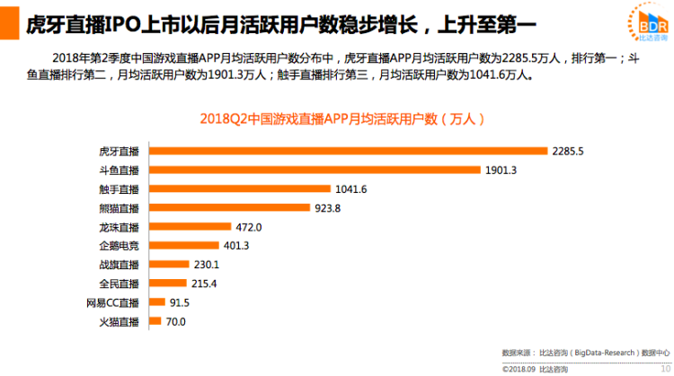 国内知名数据机构比达咨询(BigData-Research)近日发布了《2018年第二季度中国游戏直播市场研究报告》,报告显示,在2018年第2季度主要游戏直播APP月均活跃用户数排行中,虎牙直播月均活跃用户数为2285.5万人,排行第一;斗鱼直播月均活跃用户数为1901.3万人,排行第二;触手直播月均活跃用户数为1041.6万人,排行第三。