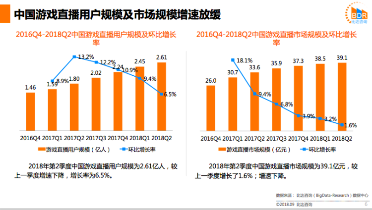 与此同时,中国游戏直播的用户规模及市场规模增速也出现放缓,比达咨询的数据显示,2018年第二季度中国游戏直播用户规模为2.61亿人,较上一季度增速下降,增长率为6.5%。第二季度的游戏直播市场规模为39.1亿元,较上一季度增长了1.6%,增速下降。
