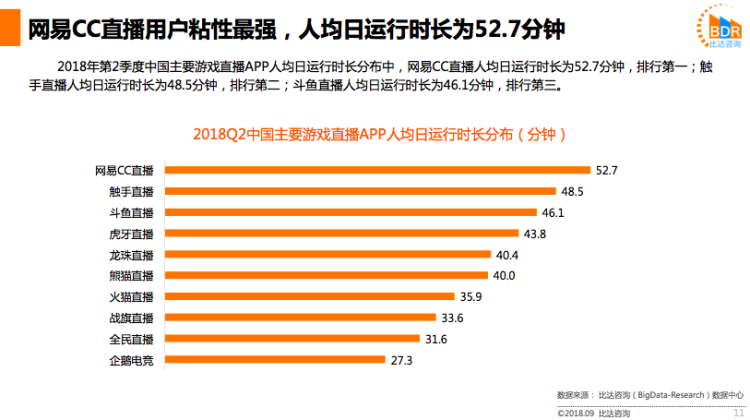 报告中还分析了第二季度游戏直播app的人均日运行时长排名,其中网易CC直播以人均运行时长52.7分钟位列第一,触手直播人均日运行时长为48.5分钟,排名第二,斗鱼直播人均日运行时长为46.1分钟,排名第三。通过这一排名可以看出,尽管斗鱼、虎牙的市场在行业处于前列,但在用户粘性方面却稍逊一筹,落后网易CC、触手直播。