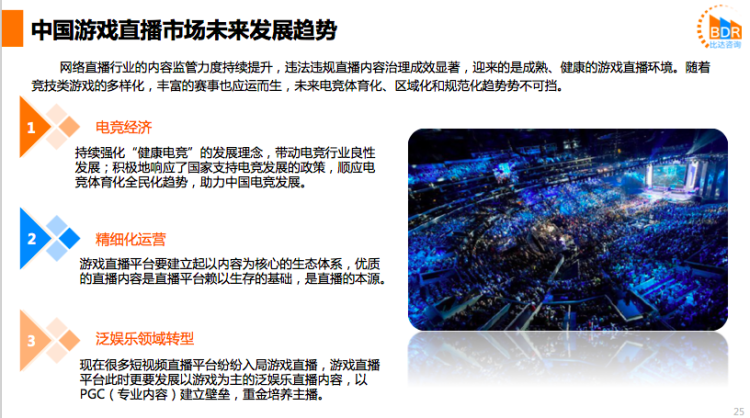 比达咨询在报告中也指出了中国游戏直播市场未来的发展趋势,电竞经济、精细化运营、泛娱乐领域转型将成为游戏直播平台未来竞争与发展的趋势。电竞在国内的发展趋势已经不言而喻,但这个市场发展的仍然还不够成熟,未来在国家政策的指导下,电竞产业将得到更快的发展,而游戏直播平台将在电竞产业中扮演重要但角色。