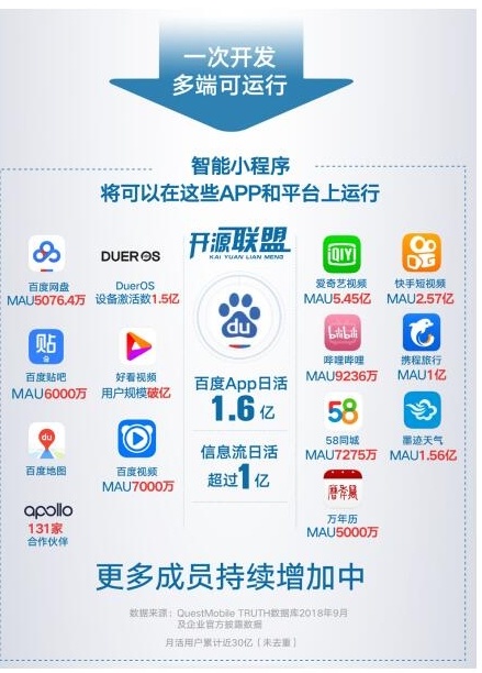 据介绍,首批加入百度智能小程序开源联盟成员还包括bilibili、快手、墨迹天气、携程、万年历、58同城、百度地图、百度视频、百度贴吧、百度网盘、DuerOS、好看视频等各行业头部App和平台。这些App和平台将在年内陆续接入智能小程序开源平台,届时开发者只需要开发一次智能小程序,就不仅可以在百度App还可以在开源联盟的所有平台上运行。