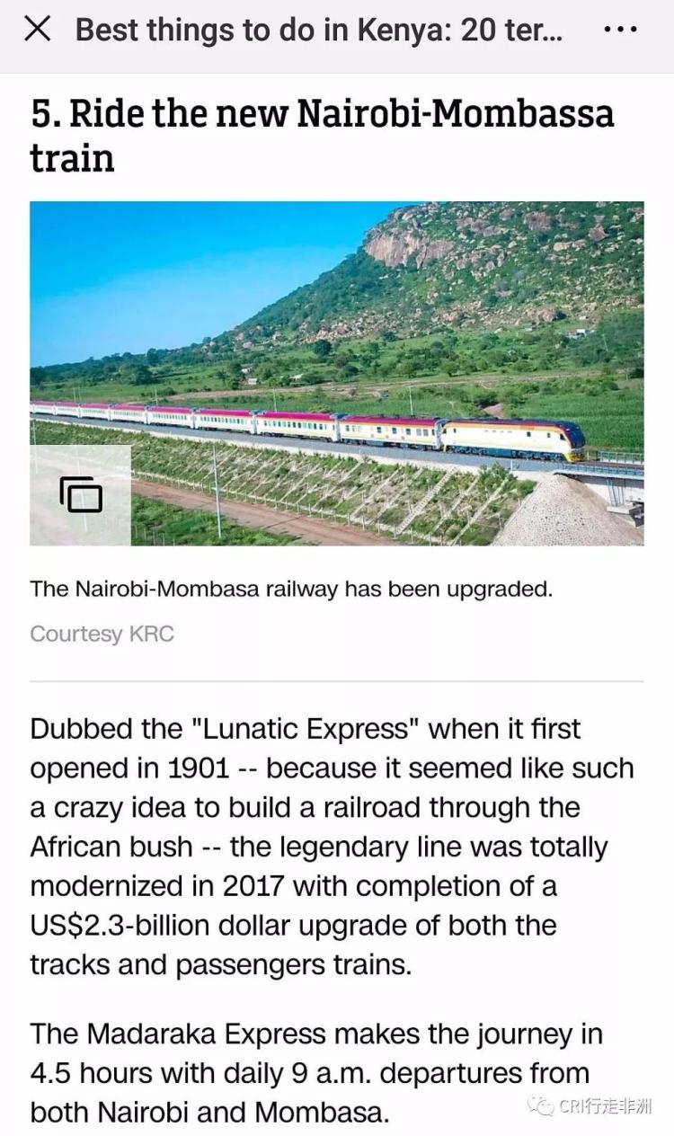 近日,美国有线电视新闻网(CNN)旅游频道为配合美国和肯尼亚实现直航而推出一期特别报道,向美国游客推荐到肯尼亚最值得做的20件事,其中,“乘坐蒙内铁路列车”妥妥上榜,排在第五位。