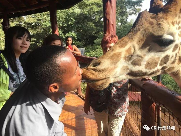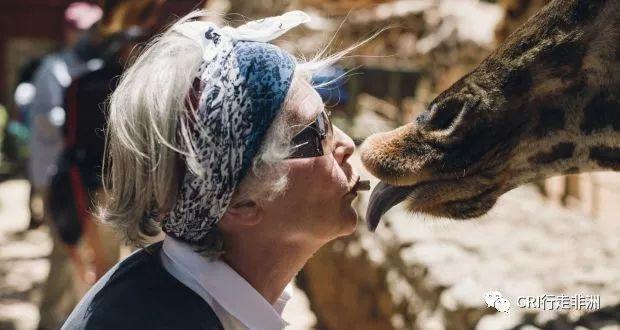 16、在内罗毕市郊凯伦的长颈鹿公园用舌头给长颈鹿喂食。