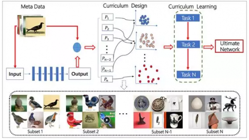 CurriculumNet:研究人员在WebVision数据库上训练他们的模型结构,该数据库包含了超过2,400,000张带有噪声标签的图像。他们的方法是在整个数据集上训练一个Inception_v2模型,之后研究所有图像映射到的特征空间;此后,CurriculumNet将这些图像分组,根据特征空间中所有图像的相似程度将每个类聚成三个子集。接着,他们开始使用具有相似图像特征的子集用于模型训练,再混合到噪声较大的子集中训练。通过高质量的标注数据迭代学习分类器,随后添加具有噪声的数据来加强分类器,研究人员表示这种增加噪声数据训练的方式不仅能提高模型的性能还能增强其泛化能力。