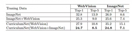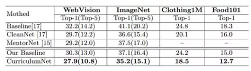 测试效果:研究员用CurriculumNet测试了四个基准:WebVision、ImageNet、Clothing1M和Food101。他们发现,使用最大量的噪声数据训练的系统比那些没有噪声数据训练的系统甚至有着更高的准确度。这一方法使WebVision上的错误率减少了多个百分点(“这些进步对于如此大规模的挑战是至关重要的,”研究人员表示)。更进一步,CurriculumNet在WebVision上的准确度最高,而且训练数据越多(例如结合ImageNet和WebVision的数据集进行训练时),性能越好。