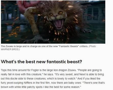《今日美国》称驺吾非常棒,在《神奇动物2》中新出场的动物中,堪称最佳。人们一定会爱上它的。