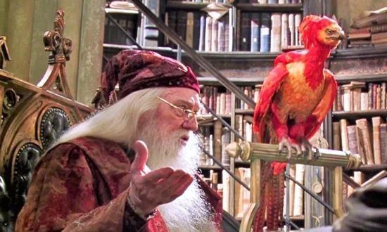 《哈利⋅波特》剧照中的邓布利多和凤凰。凤凰在中国作为神鸟的地位源远流长,已融进了中国文化的血脉中,最早也是见于《山海经》。《哈利波特》系列电影的第五部《哈利⋅波特与凤凰社》中,霍格沃茨校长邓布利多的宠物,就是一只凤凰。
