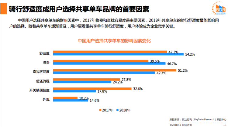 比达咨询调研的数据显示,影响中国用户选择共享单车品牌的因素中, 2018年共享单车的骑行舒适度最能影响用户的选择,有超过5成(54.2%)的用户将骑行舒适度视作选择共享单车品牌的首要因素。