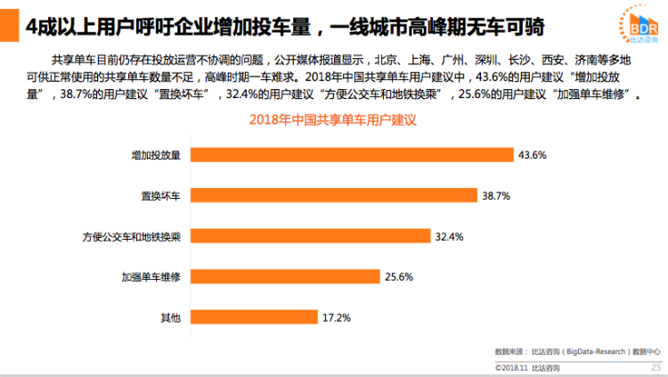 不过,《报告》同时指出,尽管目前共享单车仍存在投放运营不协调问题,但超过四成的用户仍建议增加投车量。