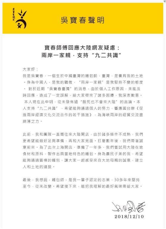 10日,他以自己和公司的名义在官网连发两条声明,明确表示,“身为中国人,是我的骄傲,‘两岸一家亲’是我坚持不变的态度”。最重要的是,吴宝春非常坚决地申明,自己从未发布过“饿死也不会来大陆”的言论,自己支持“九二共识”。