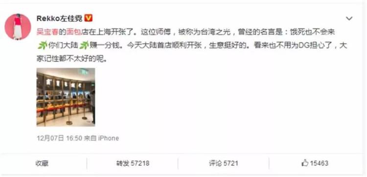 事实上,吴宝春在大陆开面包店引发风波,这不是第一轮。早在今年3月,台媒就爆出,吴宝春将与新加坡西点集团合作,在上海展店。当时就有人指认吴宝春可能是“绿色台商”,引发争议。