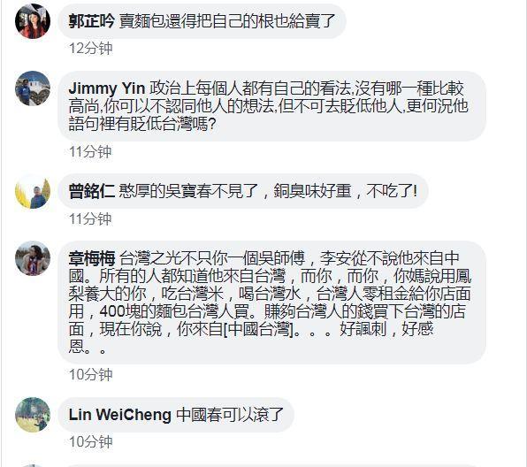 而另一方面,在脸书上,一些台湾人更是怒不可遏,深感背叛,不仅说自己再也不会去吃吴宝春的“九二共识面包”,还有人表示,吴宝春应该滚出高雄,滚出台湾,去大陆赚钱好了,甚至有人说“台湾人不要买中国人的面包”。