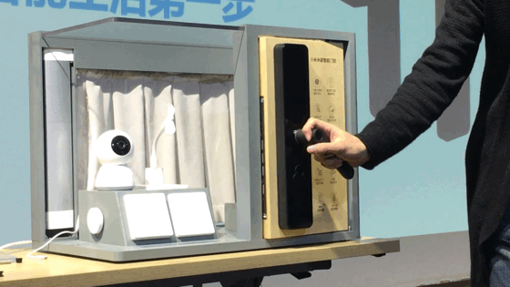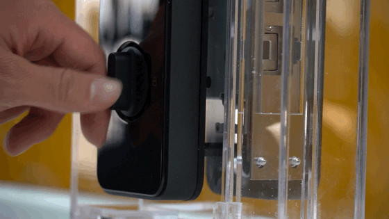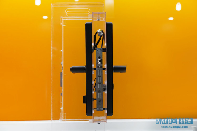 我们这次体验的米家智能锁和以往产品一样安装在展架上,不同的是这个展架由透明亚克力板组成,我们可以一眼看到内部结构。