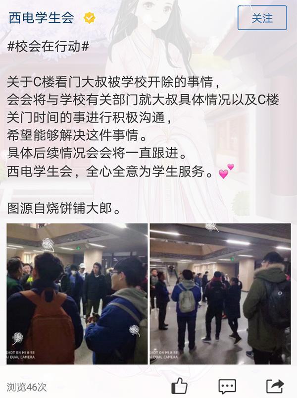 西电一位大二在校生告诉澎湃新闻,12日晚,自己在西电学生会的QQ空间里看到C楼楼管大叔要离开的消息。他说,学校为了同学们的安全着想,规定C楼在十点半之前必须离开,而大叔不忍心赶同学们走,留着门让同学们多学一会儿,“情与理发生冲突,大叔寒心了”。