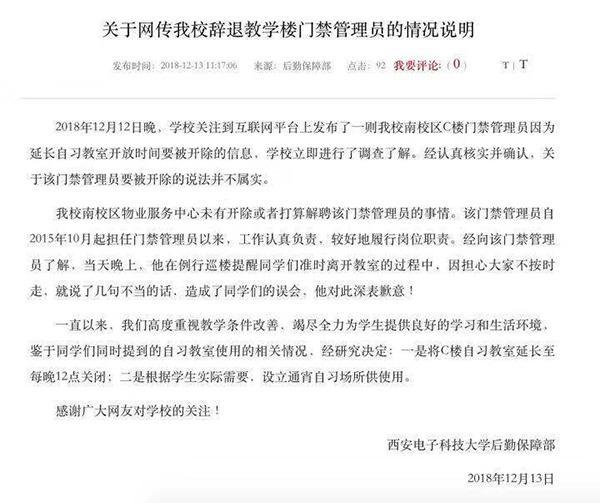 针对网传一位楼管大叔因照顾考研学生学习未按时锁门被开除一事,西安电子科技大学12月13日在该校新闻网发表声明称,经认真核实并确认,关于该门禁管理员要被开除的说法并不属实。同时,C楼自习室延长至每晚12点关闭。