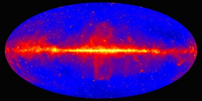 九年费米数据编制的宇宙地图,展示了可观测宇宙的伽马射线源。