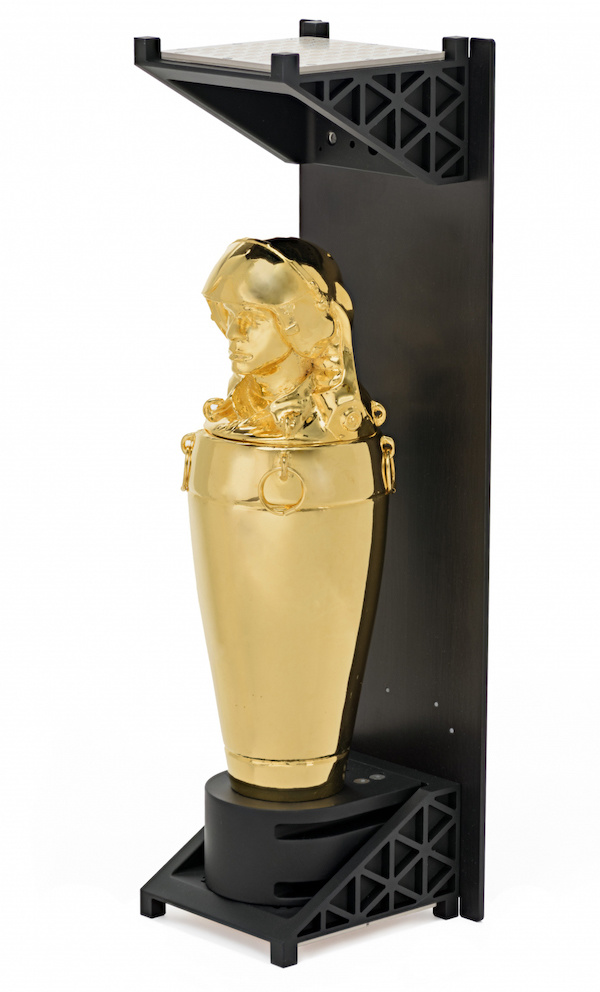 如果说,面容神秘的班克斯已经够夺人眼球,那么观念艺术家塔瓦雷斯·斯特拉坎的艺术思维更是“脑洞”大开,因为他以已故宇航员小罗伯特·亨利·劳伦斯半身像制作了一个24K金“坛子”,打算用此容纳劳伦斯的“灵魂”并发射到太空,以此向故人致敬。