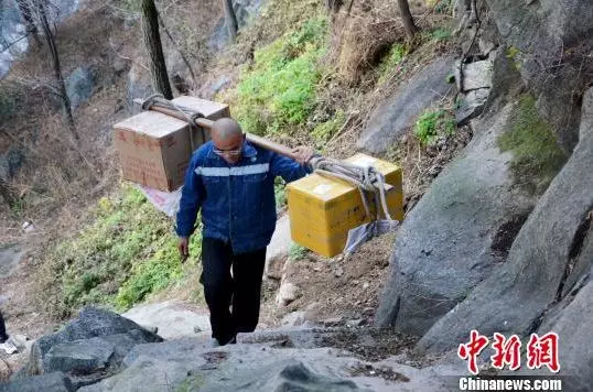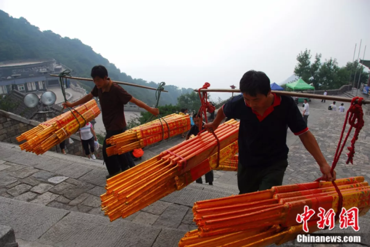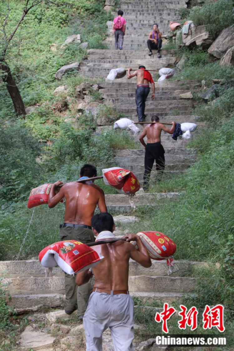 泰山海拔1540米,山顶的物资输送全靠挑山工的硬实肩膀和勤快腿脚。大到桌椅板凳,小到矿泉水、方便面,不论货物大小轻重,他们跋涉山川,都要将其运送到目的地。偶尔有“庞然大物”,更是需要众挑夫合力运送。
